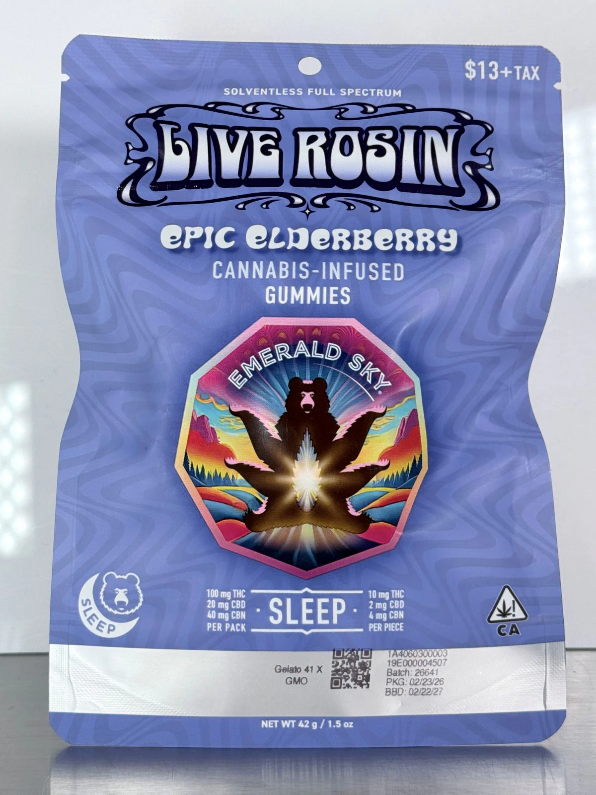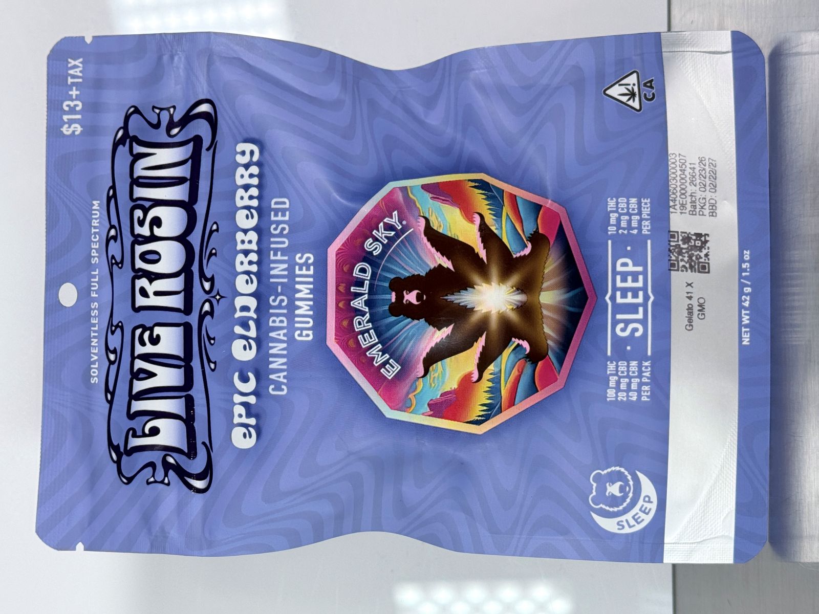 A Bit About The Product: Emerald Sky Epic Elderberry CBN Rosin Gummies are artisan-crafted, strain-specific, solventless live rosin edibles designed for sleep and relaxation. Each gummy typically features a 10:2:4 ratio 10mg THC, 2mg CBD, 4mg CBN, offering a potent, full-spectrum, indica-leaning experience with a sweet elderberry flavor.
